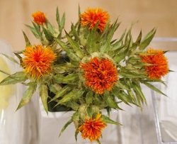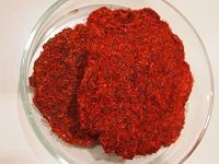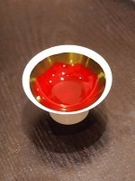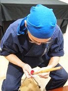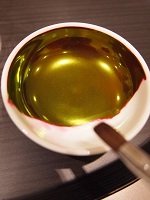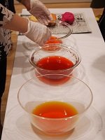 まず紅花から紅が出来るまでを学びます。各テーブルには紅花のドライフラワーが置かれていたのですが、鮮やかなオレンジ色の花からどうやって鮮やかな紅が取れるのか最初はなかなか想像できませんでした。それもそのはず、一つの紅花から取れる赤色色素の量はたったの1%! 紅は約1,000個分の紅花からお猪口一個分の量しか取れないほど、とても貴重な素材というから驚きです。さらに、紅花から紅を作る工程も。まずは紅花生産農家で「花摘み」→「紅花の花洗い」→「紅花の発酵」→「紅餅(発酵した花びらを臼で搗き、団子状に丸めて押しつぶし、天日干ししたもの)作り」の作業を経て、紅問屋へ運ばれます。ここから先が紅職人さんのお仕事です。「紅餅から色液を作る」→「ゾク(麻で作った紐の束)を浸す」→「ゾクを絞り紅液を作る」→「紅の抽出」→「紅の採取」→「紅の保存」→「紅を刷(は)く」工程を経て、紅は完成します。今回は、紅職人さんの作業である「紅餅で色液を作っての試し染め」と、「お猪口に紅を刷く」実演を見学しました。