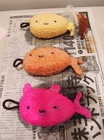 ※写真は左から「紅餅」、中央「3種の液で試し染め中」、右「染め上がったスポンジ」