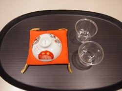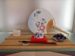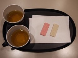 最後は紅染めのお菓子と紅花茶をいただきました。現在でも、紅花は実はさまざまな食品の着色料として利用されているのだそう。今回は紅花染めの落雁を紅花茶と一緒に。落雁はピンクの色合いが可愛らしく、口の中でほろっと溶けていき、幸せな気分になりました。息子も喜んで頬張っています。紅花茶も癖のないすっきりした味で、お菓子との相性が良く、美味しくいただけました。思い出してみると結構市販のお漬物などの商品詳細ラベルの原材料欄に「ベニバナ色素」と記載されていた記憶があります。食品の着色料として使われる位ですので、口紅として利用するのも、体に安心という訳ですね。以上でワークショップは終了となりましたが、予想以上に濃い内容の日本文化について学べたというのが筆者の感想です。こんな素晴らしい紅の伝統・製法を守り続けた伊勢半本店の皆様に頭が下がります。ワークショップ後は、ミュージアム会場の常設展示を見学させてもらい、これまた素晴らしい細工のお化粧道具や錦絵等を見学させて頂き、大満足でミュージアムを後にしたのでした。この充実度で無料だとは…神対応のミュージアムですね。