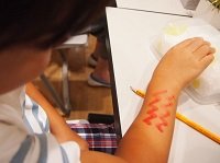 お守り作りが終わった後は、紅点(さ)し体験。玉虫色の紅は水を含ませた筆で溶くと紅色になるので、この紅を唇に点(さ)したり、タトゥーの様に肌に描いていきます。さすがに息子の唇に紅を点(さ)すわけにはいかないので(笑)、腕にタトゥー風に模様を描いて、私が唇に紅を点(さ)してみました。水分多めに溶いた紅だったので、唇は淡いピンクになりました。水分少なめに溶くと、濃いピンクになるので、水分の加減でいろんな色味を楽しむことができます。ただし、実際に使うならリップクリームと併用した方が唇はしっとりしますよ。また、タトゥー風に肌に紅で模様を描くと、光の加減で玉虫色に見え、ミステリアスに仕上がります。
