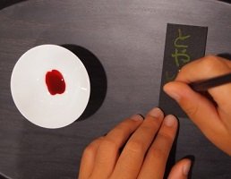 最後に、紅を使ってお守り作りに挑戦。もともと昔から、赤色は魔除けの力があると信じられてきた色で、なかでも紅は特に大切な時に使われてきました。例えば、赤ちゃんが生まれて初宮参りに行くとき額に紅で文字や印を書いたり、七五三のお参りに行く娘さんの着物に赤色が多かったり、花嫁さんの婚礼衣装の白無垢にも赤が部分的に取り入れられているのも、その名残だそうです。さっき職人さんが紅を刷いたお猪口からとった紅で、黒い台紙に自分の名前を書きます。書きあがった台紙を和紙に包み、赤い紐で結めば、お守りの出来上がり。驚いたのが、黒い台紙に紅で文字を書くと、玉虫色に文字が浮かび上がるということ。息子も「うわー、文字が玉虫色だ!」と大騒ぎしながら書いていました。紅職人さんたちが思いを込めて作った紅を使ったお守りですので、本当に効き目のあるお守りになりそうです!
