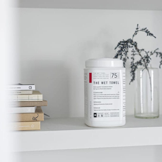 ラベルだけでなくフォルムのデザインにもこだわりがあります。THE WET TOWELは、よくある卓上ウェットティッシュのように円筒形ではなく、少し角ばった形になっています。そのため、縦に置いても横に置いても転がることなく使うことができます。家のいたるところのスキマに効率的に収納することも可能です。