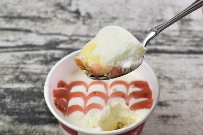 ローソン「シルフォン-シルクミルクシフォン-」のふたを開けてまず目に入るのは、トッピングされたいちごソース。真っ白い生クリームの上に、鮮やかな赤色が美しく映えています。純白の生クリームにスプーンを差し込んでみると、スプーン越しにでも伝わるほどの“ふわっ”とした感触が。