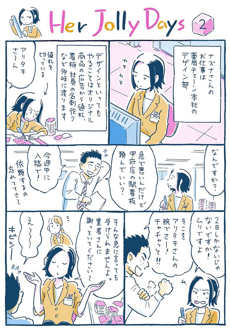 連載トップへ戻る 「2日ではムリです」 石山さやか 4コマ・漫画 漫画『Her Jolly Days』|石山さやか 2020.05.11 パート社員として働くナズナさんを中心に何気ない日常を紡ぐオムニバスストーリー。 忙しい毎日で見落としてしまいがちな小さな幸せ、自分だけのちょっとしたこだわり… 登場人物たちのそれぞれの視点に想いを馳せれば、きっとゆるく心がほどけてポッと火が灯る。 のんびり、自分らしさを生きていくヒント見つけてみませんか? 漫画を読む 第2話「2日ではムリです」 作/石山さやか この記事の写真をすべて見る(2枚)