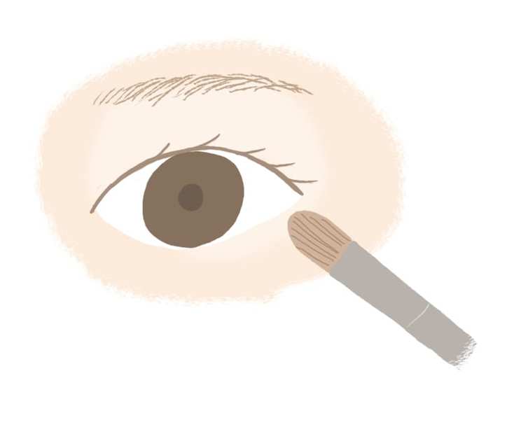ベージュやピンク系の中間色を小さなブラシにとって、目のラインに沿って塗っていきます。下側の目の際にも、小さなブラシで薄く塗ります。