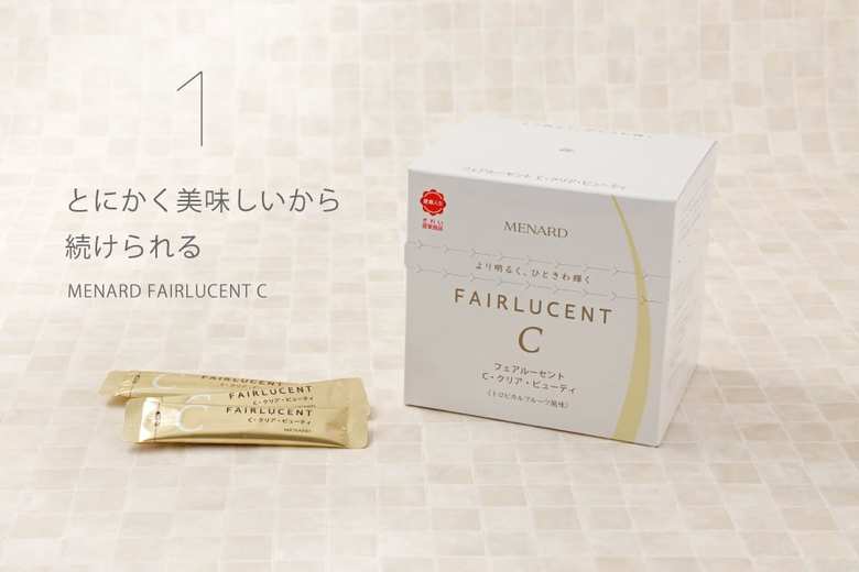 素早く溶けるビタミンCと、コーティングすることでじっくり溶けるビタミンCをブレンドすることにより、時間差で溶けるメナードオリジナルのビタミンCを1600mg配合。キレイを育む独自成分「トロピカルパワーミックス」、ビタミンA 、Eなどがサポート。トロピカルフルーツ味。フェアルーセント C・クリア・ビューティ 60包 4500円(税抜)/メナード