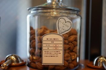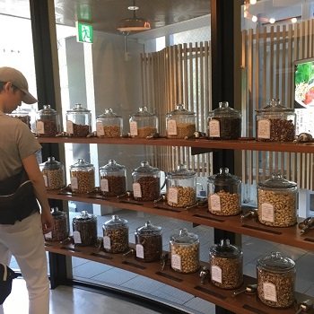 ナッツのガラス瓶がズラリと並ぶ店内は、とってもお洒落な空間です。気になるナッツは、店員さんに言うと、試しに食べることもできます。ナッツの量り売りのお店なので、大中小のビニールのバッグに、好きなナッツを好きな量詰めることができます。