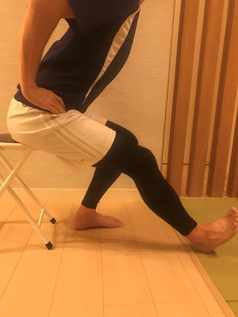 1.椅子に座った状態で、ストレッチする方の足を伸ばします。