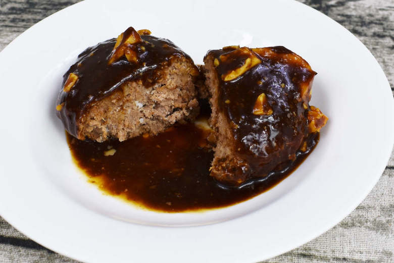 セブンイレブン「金の直火焼ハンバーグ」をレンジから取り出してお皿に移すと、黒茶色に染まったハンバーグが登場。デミグラスをベースに、フォンドボーや牛肉、鶏肉を使ったソースが濃厚な香りを漂わせています。ハンバーグは肉厚なので、ジューシーな食感が期待できそう。