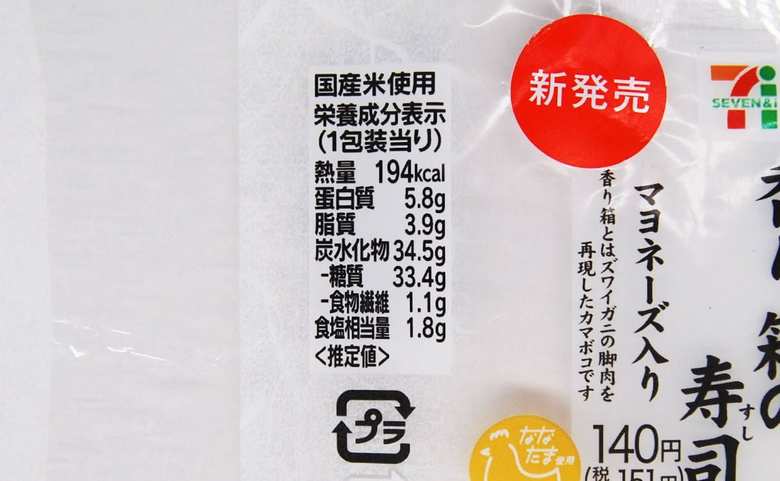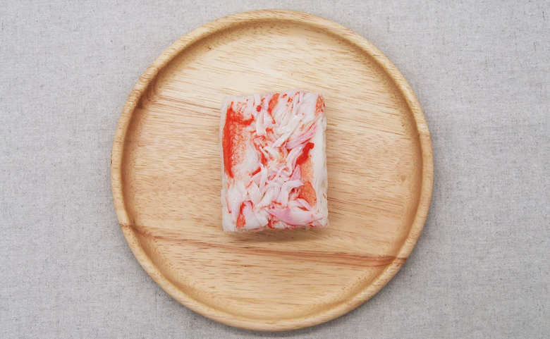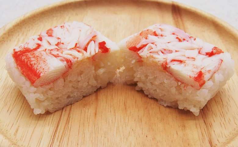 同商品に使われているのは、ズワイガニの脚肉を再現した「香り箱」という名のカニカマ。パッケージを丁寧に剥がすと、四角く握られたお酢ご飯の上にマヨネーズとカニカマが丁寧に乗せられていました。赤と白のコントラストがおいしそうな配色で、一般的なカニカマと見た目の印象はあまり変わりません。