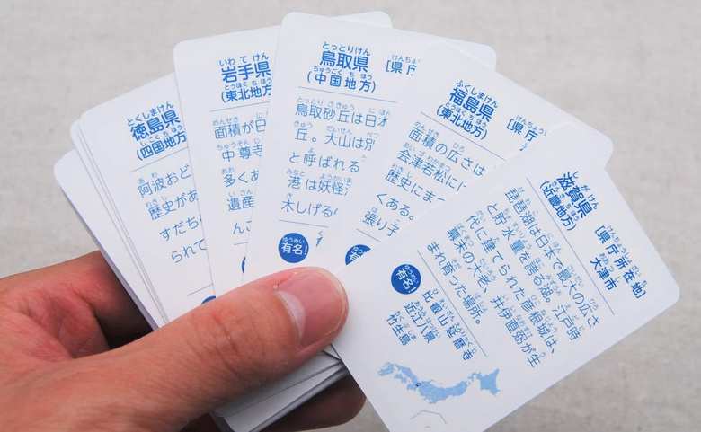 同商品は昔ながらの定番カードゲーム「かるた」をアレンジした知育玩具。絵札の表面には地図が描かれており、読み札の方に都道府県の特徴が記載されています。たとえば東京の場合は「世界中から人が集まる渋谷・浅草・秋葉原」との説明が。より詳しい解説は絵札の裏に書いてあるので、事前に学習することも可能です。