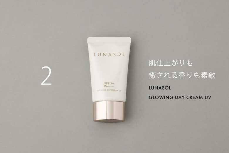 水分と油分を抱えこんだ“水ツヤ膜”を肌の上に形成するという、独自開発のラメラ乳化技術を採用。潤いを与え、紫外線ダメージから肌を守るヒアルロン酸やシアバターなど多数の成分を配合。高い保湿力で潤いを長時間キープし、水分蒸散を抑えるうるおい持続UVクリーム。ルナソル グロウイングデイクリームUV SPF40・PA +++ 40g 4500円/カネボウ化粧品