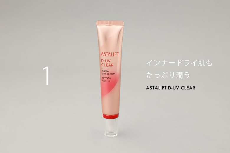 日中の乾燥を引き起こしている原因の1つが、朝に数分ほど浴びるわずかな紫外線によるという研究結果に着目して開発された最先端の日焼け止め。潤い成分を抱え込みながら、紫外線防御成分を均一に並べているという処方に、強力な抗酸化成分アスタキサンチンや3種のコラーゲンなど、美容成分を豊富に配合し、最強の日中ケアが可能に。アスタリフト D-UVクリア アクアデイセラムSPF50+・PA ++++30g 3900円(税抜)/富士フイルム ヘルスケア ラボラトリー