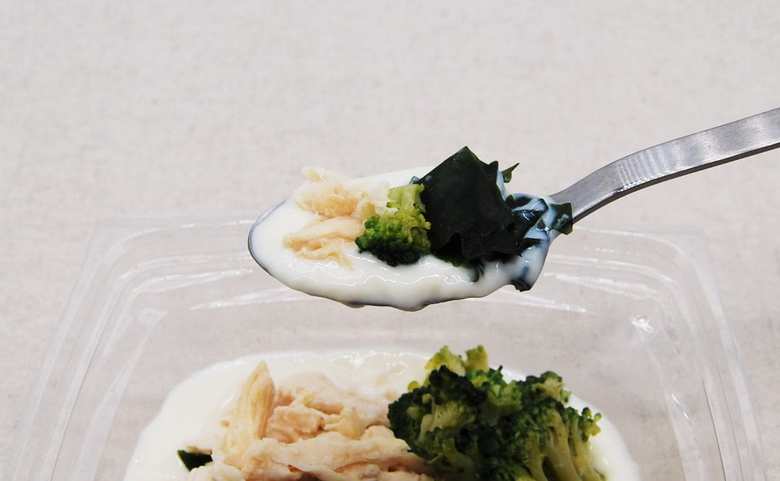 とろみが強い豆腐の上に、蒸し鶏、ブロッコリー、わかめがたっぷり乗った同商品。袋に入った付属のタレをかけ、まずはメインの豆腐を食べてみましょう。口にしてまず感じたのは、豆腐とは思えないほどのなめらかな舌触り。クリーミーな感触はプリンのようで、鰹と昆布のダシが効いたタレがよく染み込んでいました。