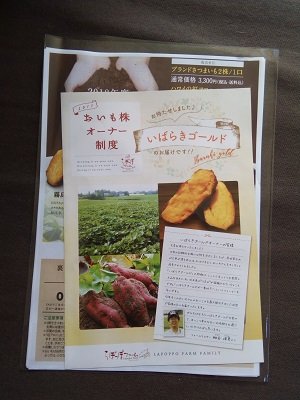 まずは、オーナーになりたい「おいも」を選びます。種類は、鹿児島県の「案納芋」、茨城県なめがたファーマーズヴィレッジの「いばらきゴールド」、徳島県の「鳴門金時、・鳴門ムラサキ」、宮崎県の「霧島紅かぐら」、さらに、ハワイの「紅アロハ」に、スカイツリーのソラマチファームで育った「スカイツリー金時」まで。スカイツリー金時は抽選ですが、ほかの種類は自由に選んで、2株1口から申し込むことができます。めずらしいブランド芋にするもよし、収穫祭などのイベントに参加したければ、比較的近い農園を選ぶもよし。私は今年、茨城県の「いばらきゴールド」のおいも株オーナーになりました。さっそく、プレゼントの干し芋や、らぽっぽのお店で使える優待カードとともに、権利書が送られてきました!