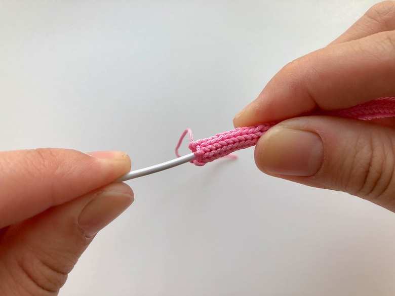 セロハンテープを巻いた端を編み終わり口からリリアンの中に入れていきます。リリアンがたるまないようしごきながら入れるときれいに仕上がります。