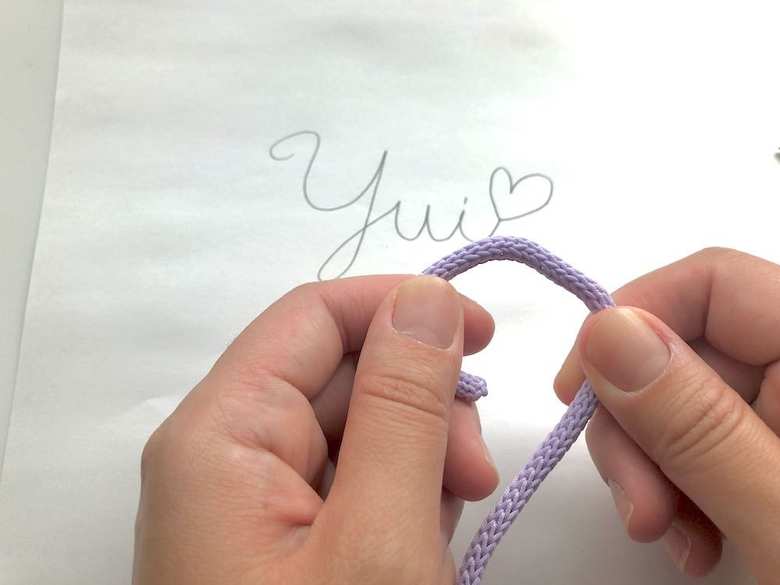 ハート部分は、端を紫とピンクの糸の変わり目に巻きつけるようにします。