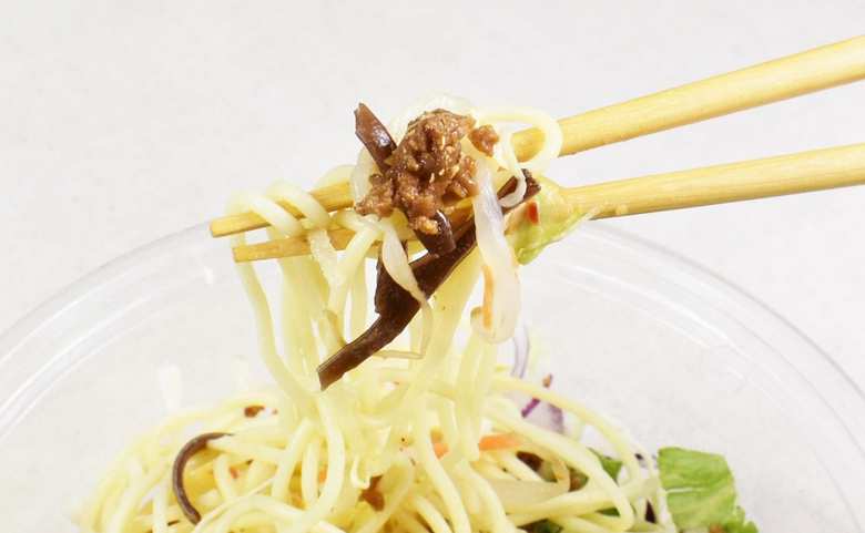 フタを開けてまずビックリなのが野菜の量。麺と比較すればよくわかりますが、明らかに野菜の方がボリューミーです。セットの担担風ドレッシングと花椒をかけて実食すると、最初に感じたのは担担風ドレッシングの痺れる辛さ。程よい辛みが野菜のみずみずしさと良く合い、箸を止めることなく食べ進められました。