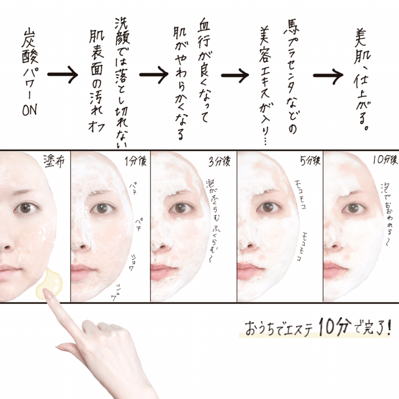 というのも、炭酸が肌の汚れをクリアにしつつ、浸透しやすい肌土台に作り変えてくれるから、馬プラセンタやコラーゲンなどの美容成分がギューッと角層に届くのです。
