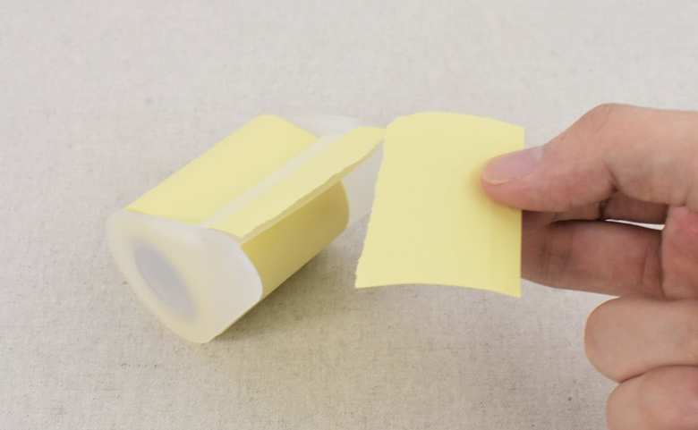 実際に同商品を使ってみると、予想以上にカットしやすい印象です。個人的におすすめしたいのが、ふせんの裏面全体に“のり”がついているところ。紙を長く切り取っても、しっかり貼りつけられるのが嬉しいですね。
