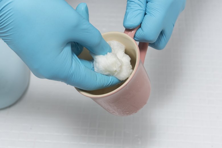 原液のまま適量入れ、キッチンペーパーを浸す。※塩素系漂白剤は「混ぜるな危険」。水以外のものとは絶対に混ぜず、必ず換気を。2、ペーパーで湿布する