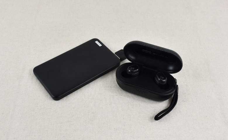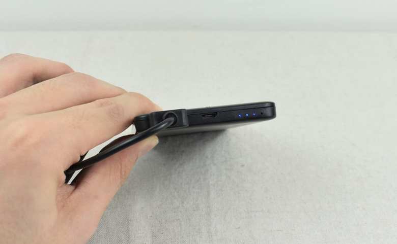 またスマートフォンはもちろん、様々なmicro-B端子のデバイスを充電できます。試しに普段から愛用している“ワイヤレスイヤホン”を繋いでみたところ、難なくバッテリーをチャージすることができました。ちなみに端子を繋いだ瞬間、側面のLEDランプが青色に点灯。4段階で光るランプは、バッテリーの残量をお知らせしてくれますよ。
