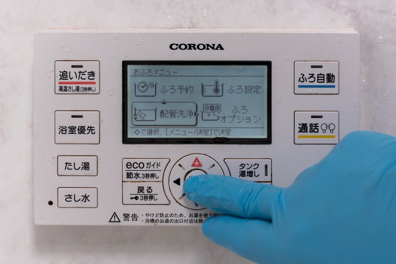 「風呂釜洗浄モード」や「配管洗浄モード」があれば押す。その後、約5分間追いだき運転をし、排水。再度、穴より5㎝上まで水をため(※自動運転でためないこと)、5分追いだきする。最後に排水して終了。