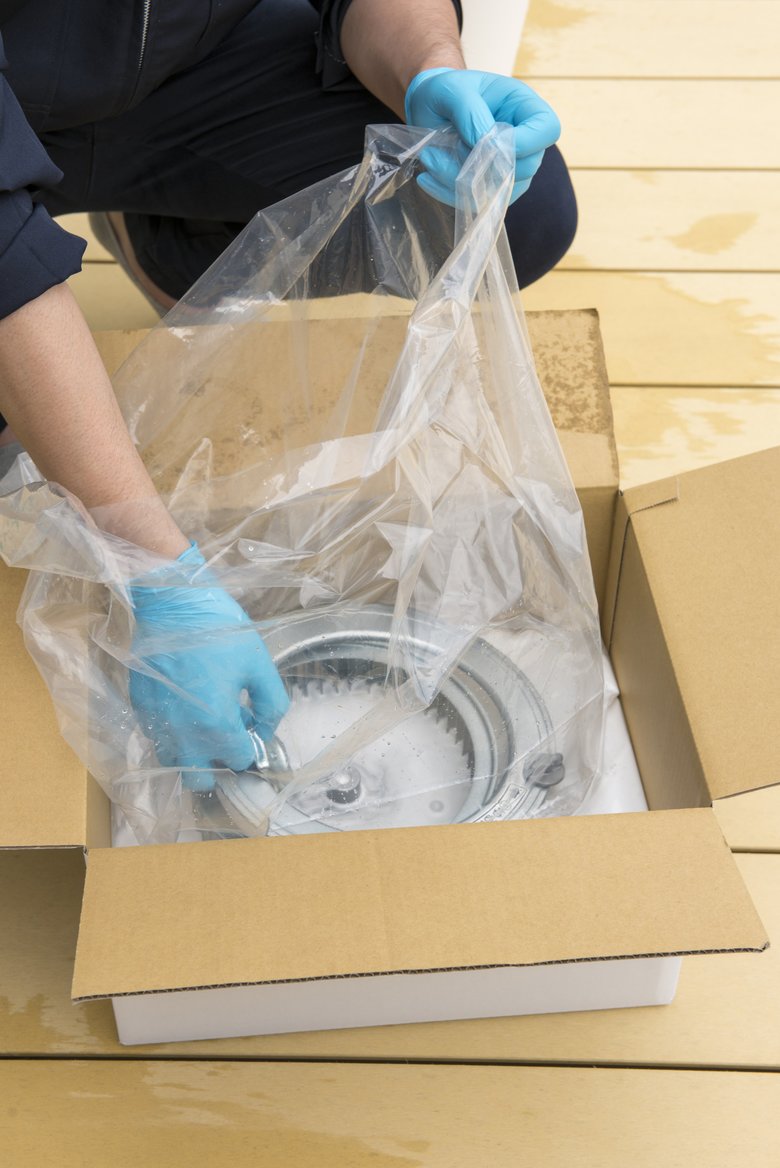 4、パーツを洗浄液に浸し、袋の口をしばる