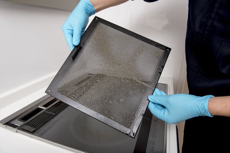 レンジフードを開け、フィルターと換気扇本体(またはシロッコファン)を取り出す。フードも取りはずしできれば行う。ネジなどのパーツは、ひとまとめにして保管しておくこと。ちなみに掃除前のフィルターの写真はこちら