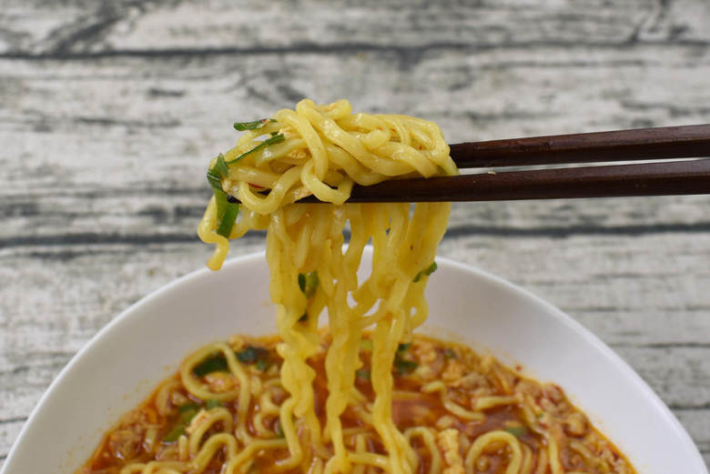 口に含んだ瞬間、唐辛子のピリッとした辛みが舌を刺激。額がじんわりと汗ばむくらいの気持ちいい辛さです。細い麺はすすりやすく、ツルツルした舌触りなのもGOOD。刻みにんにくの味もきいているため、元気がどんどんみなぎってきます。