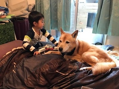 兄弟のような関係になると、息子が風邪をひいたりなど息子の体調の変化にも犬は敏感になります。いつもより元気がないとかわかるのでしょう。最近は、パパをも凌ぐ、イクドッグぷりを発揮しています! 例えば、風邪の時寝室に寝かせ、別の部屋で用事をしているとき、子供がうなされたり泣いたりすると、寝室に行って戻ってきて、私に知らせてくれます。寄り添って一緒に寝たりもします。泣いていたら、涙や鼻水まで舐めようとして慰めてくれます(基本的にはあまり舐めさせてはいませんが)。怒られて泣いても同じように慰めます。 最近では、私が朝寝坊してしまいいつもの時間に子供を起こさないと、犬が自分から寝室に行って、息子が寝ているそばにお座りして、起きるまで待っていました。 パパよりも的確過ぎて、感動してしまいました!