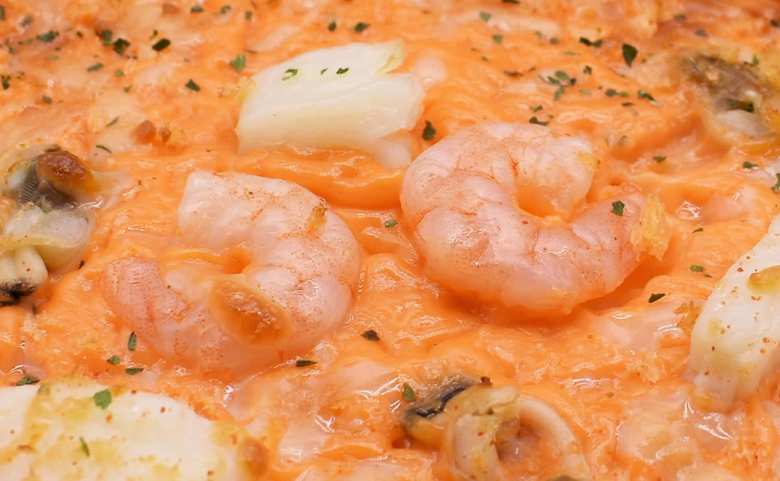 焦げ目のついたチーズのなかに入っているオニオンソテーもポイントのひとつ。えびやあさりのうま味を、こうばしいオニオンがさらに引き立てています。