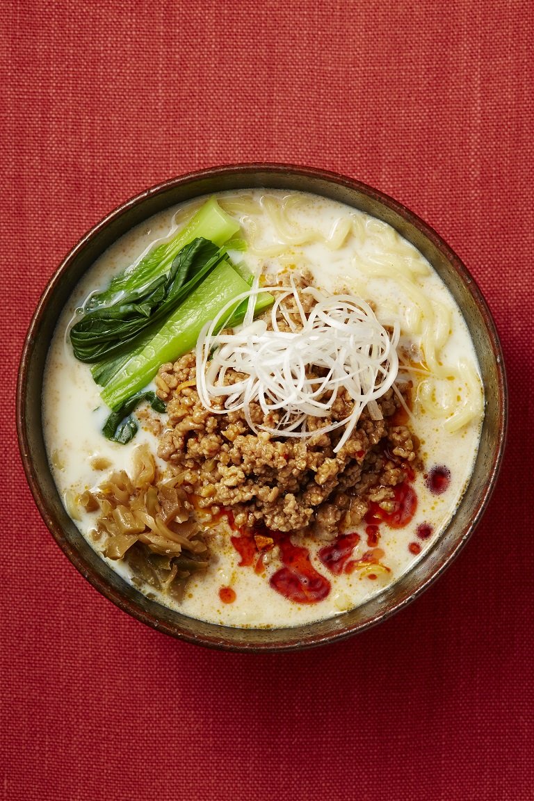 豆乳と練りごまで作る、やさしくクリーミィなスープがベース。そこに、食べるラー油で辛みをきかせた肉だねと、塩けの強いザーサイを加えると、飽きのこない味の変化が楽しめます。肉だねには花椒を加えると、本格的なしびれる辛さになります。