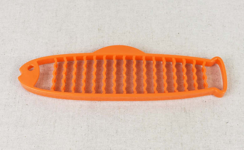 オレンジ色の魚型に、波状の仕切りがついている同商品。大きさは一般的な魚肉ソーセージよりも一回り大きいくらいで、裏返すと仕切りの先端が鋭くなっています。使い方は、ソーセージの上にカッターを乗せて下まで押し込むだけ。軽い力であっという間に切れるため、時短にもなりますね。カットされたソーセージは9.5mmほどの厚みになり、一口で食べるのにちょうどいいサイズです。