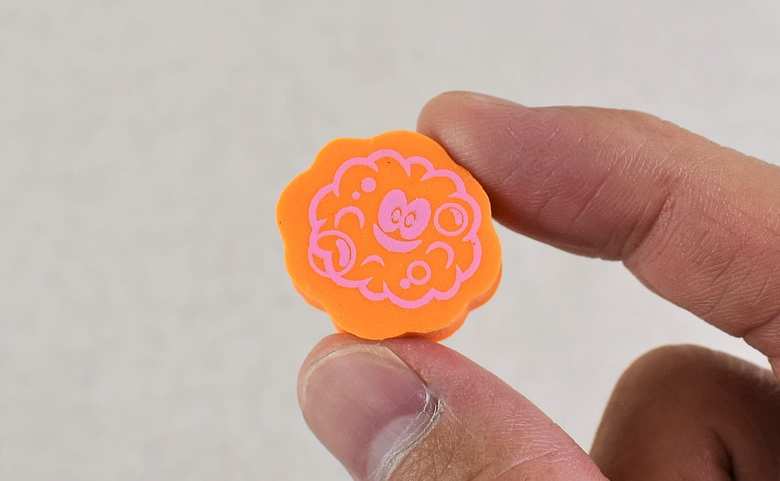塩化ビニル樹脂で作られた消しゴムが6個セットになった同商品。消しゴムのボディにはモクモクとしたケムリのようなキャラクターが描かれています。大きさは約2.3(縦)×2.5(横)×0.8cm(高さ)ほど。一見するとデザインが可愛らしいこと以外、普通の消しゴムとの違いは見あたりませんね。