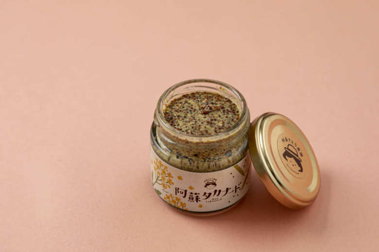 「阿蘇タカナード」は、「阿蘇高菜」という伝統野菜であるからし菜の種子をベースに、全て熊本県産の材料を使って作られたマスタード。「阿蘇高菜」は浅漬けにするととてもおいしいのですが、旬がとても短く、収穫が始まって一週間も経てば花が咲き漬物にはならなくなります。そこで、収穫が間に合わなかった花をさらに育てて種子を取ったものを原料に、このマスタードが作られました。農家さんの育てた作物を余すことなく活用して、次世代に繋いでいきたいという思いが込められています。