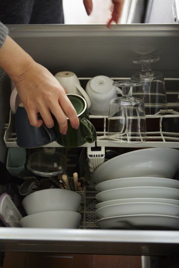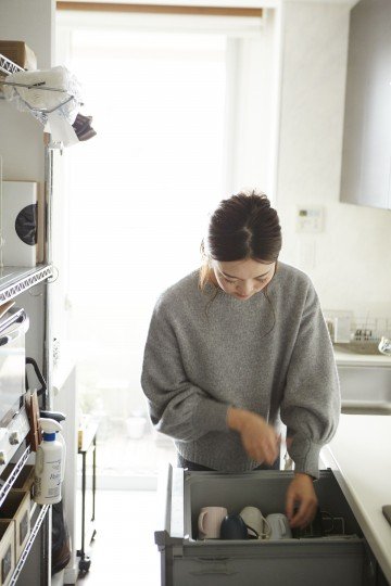 皿洗いは食洗機におまかせ。洗い終わったら片づけずに、ここから出して使うことも多い。「夕食の食器を片づけるアクションがなくなり、グッとラクになりました」