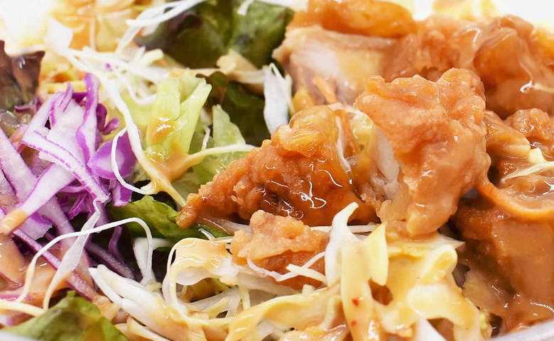まずサラダを一口いただいて驚いたのは、ソースの濃厚な旨味でした。テリヤキソースの甘辛さと、マヨネーズの酸味が見事に調和。決め手になっているのはショウガの風味で、まろやかな全体の味に奥ゆきを与えています。