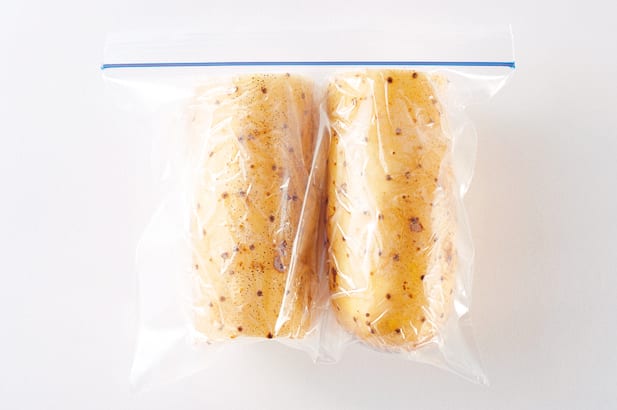 皮つきのまま洗って、キッチンペーパーで水けをよくふき、そのまま冷凍保存用袋で保存する。皮をむいてひと口大や千切りにしてから冷凍しても便利。