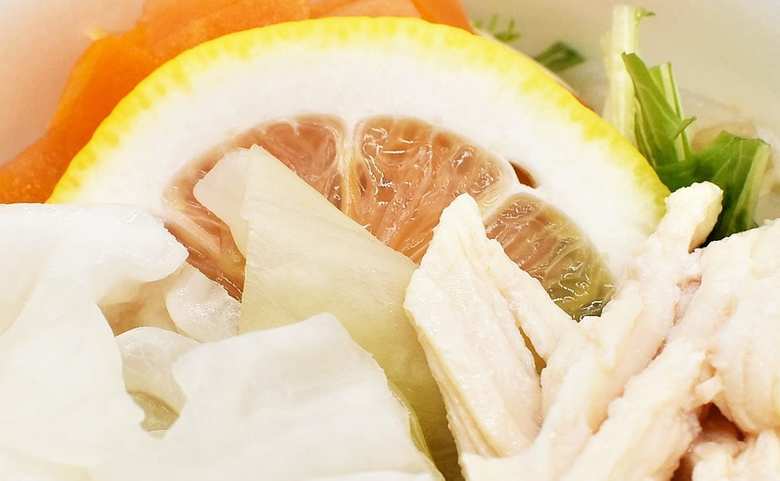 蒸し鶏に加え、キャベツや人参など野菜がバランスよく入った同商品。中央には輪切りにされたレモンがドンと乗っかっています。メインのスープは塩ベースにレモン汁をプラス。酸味の効いたさっぱりとした味わいが堪能できそう。