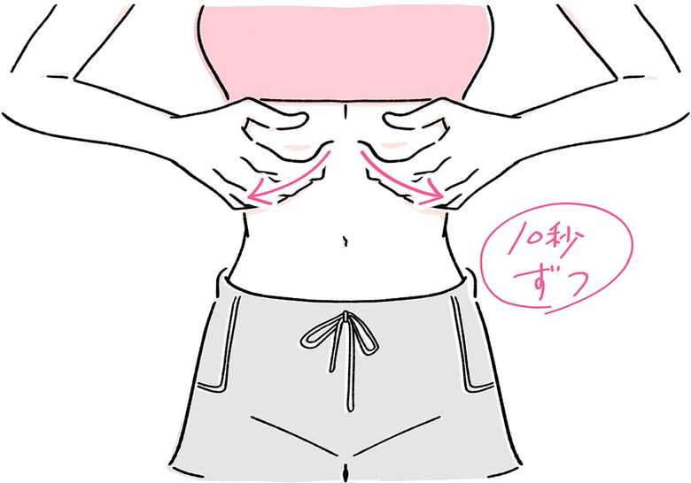 あお向けになり、肋骨の下に親指以外の指を入れ、肋骨に沿わせるようにみぞおちからわき腹に向かって10回押し流します。押し流すタイミングで息を吐き、お腹をゆるめることでほぐしやすくなります。