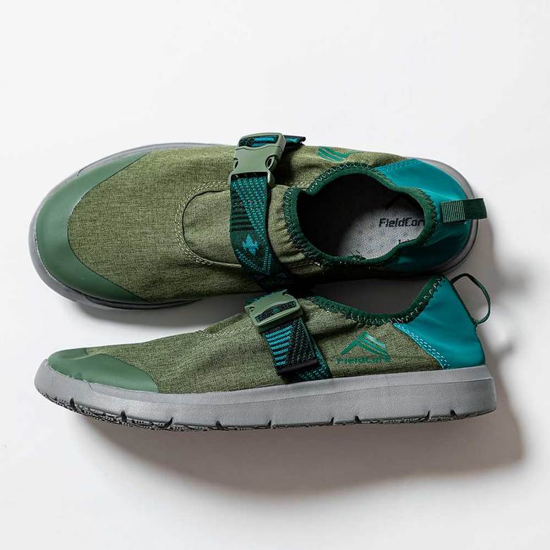 アウトドアテイストのスリッポンシューズ。デザインの織りベルトとグリーンのグラデーションのカラー使いがおしゃれで、デイリーユーズでもめちゃめちゃ使えそうです。
