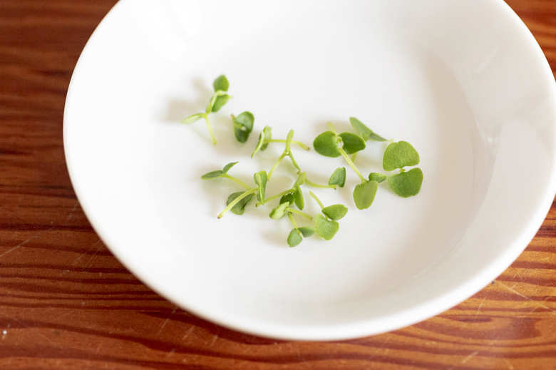 気温や湿度によりますが、こちらがだいたい10日くらいたって双葉まで育った状態です。よく育つように、必要に応じてハサミやピンセットで、間引いてあげましょう。