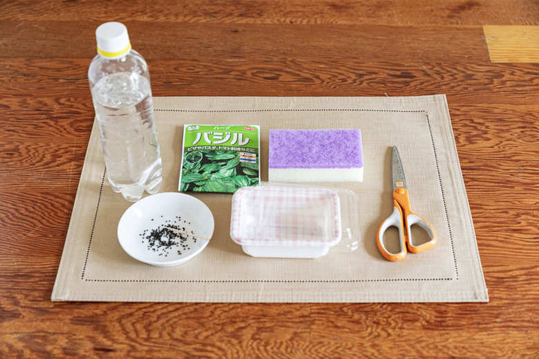 今回は、バジルを育ててみましょう。用意するものは、「タネ・スポンジ・容器・水」だけ!あとは、ハサミやツマヨウジなどを必要に応じて使用します。