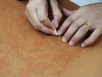 ※写真左:染色イベントにて型染め用の『伊勢型紙』を彫る職人さん / 右:職人さんによる型染め途中の反物