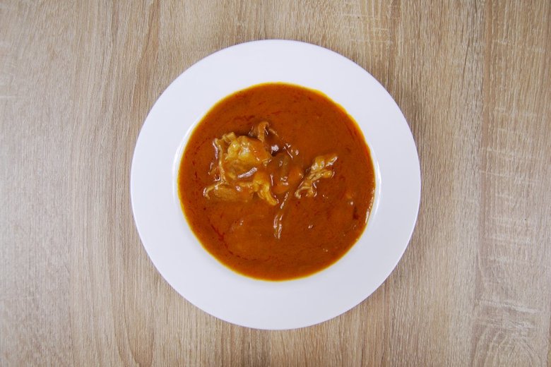 お皿に移した瞬間、ファミマ 「3日仕込みのビーフストロガノフ」の“ボリューム”にビックリ。溢れんばかりのソースと、ゴロゴロした“ビーフ”がたっぷり入っています。予想を遥かに超える内容量に、見ているだけでご飯がほしくて仕方ありません。
