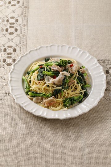 ②フライパンにオリーブオイルを熱して豚肉を入れ、中火でほぐすようにして炒め、肉の色が変わったら、菜の花の茎、赤唐辛子を加えて炒める。ふたをして1分ほど蒸し焼きにして、菜の花の葉を入れて塩、こしょうをふりサッと炒め合わせる。