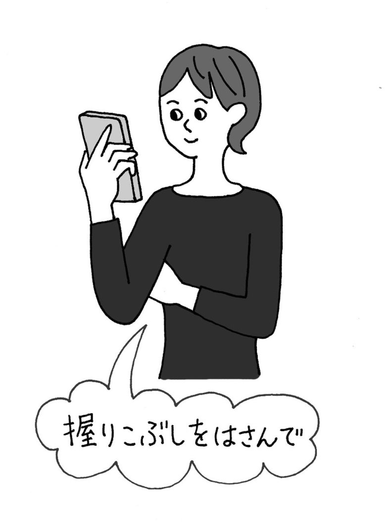 スマホや携帯をチェックするときは、画面を顔の高さまで持ち上げるのがポイント。片手で操作する場合は、もう片方の腕を曲げ、にぎりこぶしにした上に、スマホを持つ手のひじを乗せた状態で持つと、安定して正しい姿勢をキープできる。「あご押し体操」をプラスしても。