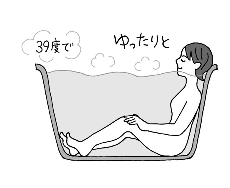 首を温めると関節が動きやすく、あご押し体操効果アップ。あごまでつかる全身浴で、10~20分ほどつかればぽかぽかに。のぼせやすいので、体調に応じてムリしないこと。髪を洗うときも首が前に出ないよう注意。あがったらすぐ髪を乾かして湯冷めを防止。「あご押し体操」をプラスしても。