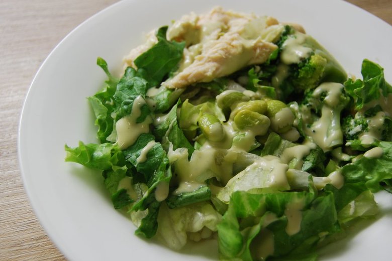 まずはサラダをお皿に盛りつけると、出てきたのは緑色の食材ばかり。レタスやブロッコリー、枝豆が出てきて「緑づくしで飽きないかな…」と不安になりましたが、肉要素の蒸し鶏を見つけた時はほっと一安心。さらに体にやさしいもち麦も入っていたので、ローソンの食材選びのセンスに感心しました。ビジュアルだけではなくて、ヘルシー面も考慮しているのが抜け目ないですね。